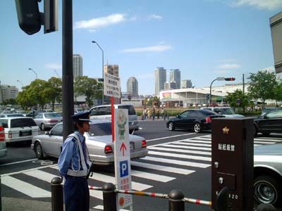 離れた路上のものですが、警備員が看板を立てて誘導して